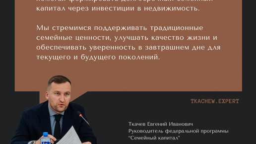 Миссия федеральной программы “Семейный капитал”: Создавать прочный фундамент для стабильного, безопасного и благополучного будущего семей, помогая формировать долгосрочный семейный капитал через инвестиции в недвижимость. Мы стремимся поддерживать традиционные семейные ценности, улучшать качество жизни и обеспечивать уверенность в завтрашнем дне для текущего и будущего поколений. Ценности федеральной программы “Семейный капитал”: 1. Семья как основа благополучия: • Поддержка традиционных семейных ценностей, укрепление связей между поколениями...