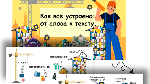 Презентация по русскому языку «Как всё устроено: от слова к тексту». Данная презентация разработана по теме «слово, словосочетание, предложение, текст» для учащихся второго и третьего классов. Презентация построена по принципу образно-наглядного представления изучаемого материала. Такое представление позволяет учащимся в виде образных ассоциаций лучше усвоить материал. Презентация оформлена в теме строительной площадки, где строятся различные дома-тексты. Строительным материалом для домов-текстов...
