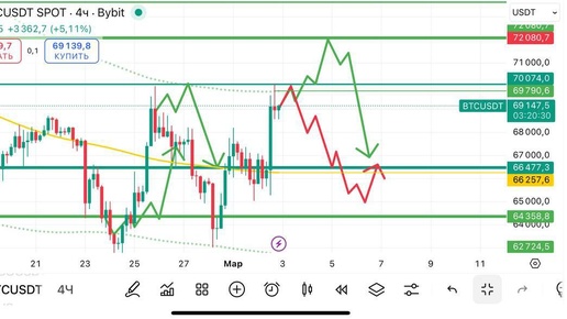 ? Рост или падение? Вот и началась у нас торговая неделя и ознаменовалась она ростом до 70 тысяч. Давайте разбираться, что ждать дальше по биткоину Итак, начнем с того, разворотной структуры, несмотря на то, что мы отскочили от 70 тысяч не сформировалось Если оценивать текущие шансы на рост или падение, то они равны между собой Если мы видим фиксацию над 69...