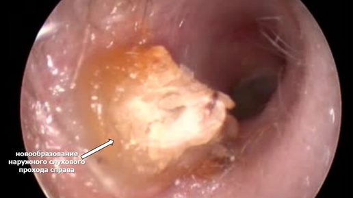 Всем привет, ЛОР-хирург на связи! Хочу поделиться с вами одним интересным случаем из практики. Ко мне на приём пришёл мужчина, 35 лет, с жалобой на банальный дискомфорт в правом ухе. Ни стреляющей боли, ни гноя — просто что-то мешало. Заглядываю в ухо с помощью отоскопа и вижу вот такое. Обнаружилось новообразование, приличное такое. Направляем пациента на КТ височных костей — нужно понять, что это за "зверь" и насколько глубоко он забрался. Результаты КТ нас и обрадовали, и озадачили. Эта штука успела подпортить (вызвать эрозию) костную стенку слухового прохода...