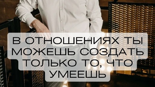 В отношениях ты можешь создать только то, что умеешь. А что ты умеешь создавать? Это легко можно понять. Чем твоя жизнь сейчас наполнена, как ты себя чувствуешь? Что в жизни имеешь? Как ты сейчас живешь? Какие люди рядом, и что с ними ты выстроил? Есть рядом люди, которые любят тебя, ценят и уважают? Значит, ты умеешь создавать ценные и надежные отношения. Это и есть то, что ты умеешь создавать на данный момент времени. Если бы умел другое создавать, то у тебя другая бы была жизнь и её наполнение...