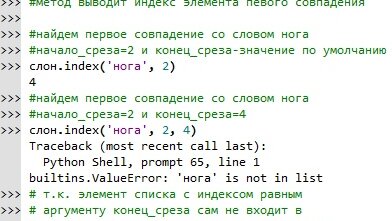 Метод list.index( ) Синтаксис: [список].index(значение, начало_среза, конец_среза) значение – искомое значение. начало_среза – индекс элемента (порядковый номер, начало отсчета 0), начиная с которого будет осуществляться поиск искомого значения. Необязательный аргумент, по умолчанию равен нулю. конец_среза – индекс элемента, заканчивая которым (сам элемент с индексом равным значению аргумента конец_среза не входит в срез) будет осуществляться поиск искомого значения. Необязательный аргумент, по умолчанию равен индексу последнего элемента списка...