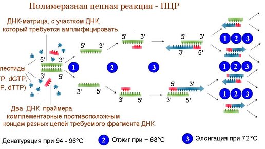 Когда вы подготовили пробы к ПЦР, то надо их поставить в ПЦР машинку и запустить амплификацию. Чтобы это сделать, надо знать, каким протоколом следует пользоваться. У реакции ПЦР три основные фазы: (1) денатурация - нити ДНК расходятся, становятся одноцепочечными, чтобы на них могли сесть праймеры, (2) отжиг - присоединение праймеры, (3) элонгация - процесс наращивания цепи, то есть именно на этой фазе работает Taq-полимераза, присоединяя к растущей цепи нуклеотиды. На этой картинке изображено то, что происходит в пробирке во время ПЦР...