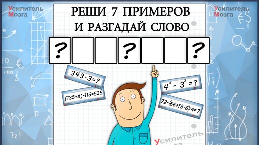 Здравствуйте, дорогие подписчики и гости канала! Сегодня вас ждёт увлекательный комплексный тест, в котором необходимо решить примеры, поразмышлять над задачкой, разгадать буквы и составить слово. Тест состоит из 7 математических заданий, которые желательно выполнять в уме. За каждый верный ответ будет открываться одна из букв зашифрованного слова. Вероятность разгадать слово увеличивается с каждым верным ответом. Ответ в виде числа необходимо вписать в специальное поле под карточкой/картинкой с заданием...
