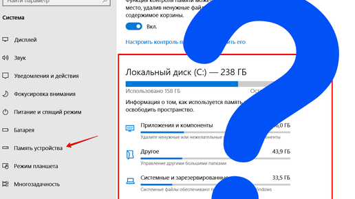 Когда на вашем жестком диске остается совсем немного свободного пространства, встает вопрос о том, что именно занимает больше всего места. Чтобы это выяснить в Windows 10 предусмотрен отдельный инструмент под названием Контроль памяти. Контроль памяти в Windows 10 предназначен как раз для освобождения дискового пространства от неиспользуемых или мусорных файлов. Кроме того, инструмент позволяет анализировать содержимое вашего накопителя и наглядно показывает, какие объекты занимают больше всего пространства...