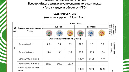 Система ГТО предусматривает несколько ступеней, отличающихся уровнем сложности. Каждая ступень имеет свои нормативы, которые зависят от возрастной группы. Ниже приведены нормы ГТО по возрастам и ступеням для женщин и для мужчин: 1. Седьмая ступень (возраст 18-19 лет): 2. Восьмая ступень (возраст 20-24 лет): 3. Девятая ступень (возраст 25-29 лет): 4. Десятая ступень (возраст 30-34 лет): 5. Одиннадцатая ступень (возраст 35-39 лет): 6. Двенадцатая ступень (возраст 40-44 лет): 7...