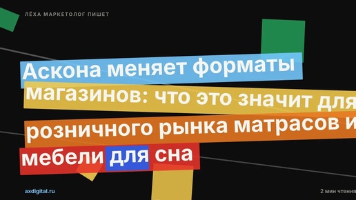 Аскона меняет форматы магазинов: что это значит для розничного рынка матрасов и мебели для сна «Когда федеральный игрок начинает играть с форматом — значит, текущий перестал отбивать аренду. Всё остальное — маркетинг.» «Аскона» анонсировала тест новых торговых форматов в 2026 году: от 600 до 3000 кв. м. Диапазон широкий — и это само по себе говорит о том, что компания ищет оптимум, а не масштабирует готовое решение...