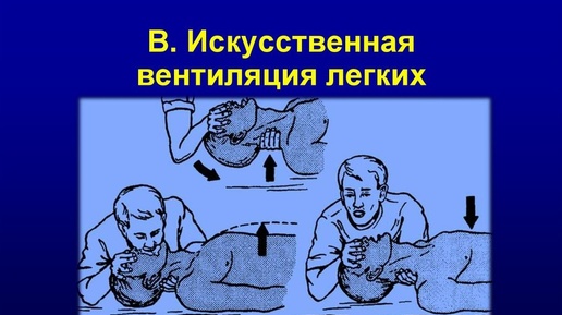 Искусственное дыхание Искусственная вентиляция лёгких (ИВЛ) — это введение воздуха (либо кислорода) в дыхательные пути человека с целью восстановления естественной вентиляции лёгких. Относится к элементарным реанимационным мероприятиям. Типичные ситуации, требующие ИВЛ: автомобильная авария; происшествие на воде; удар током и другие. Существуют различные способы ИВЛ. Наиболее эффективным при оказании первой помощи неспециалистом считается искусственное дыхание рот в рот и рот в нос. Если при осмотре...