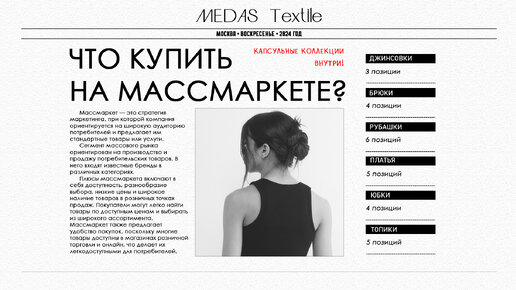 В 2024 году подавляющее большинство до сих пор имеет плохие ассоциации со словом «массмаркет». Они ошибочно полагают, что фабрики-производители поставляют одно сырьё для разных брендов, что материал этот сомнительного качества, т.к. он доступен широкой массе. Но даже такие звёзды, как Риана, Селена Гомеc, Марго Роби, периодически заглядывают на массмаркет, чтобы обновить свой гардероб. И это неудивительно, благодаря фидбэку аудитории, одежда на массмаркете стала удобной, красивой и на регулярной основе пополняется новыми позициями...