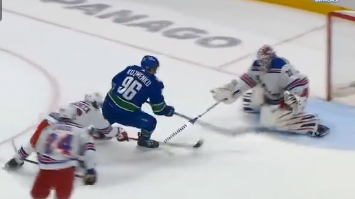 В овертайме матча «Ванкувер» - «Рейнджерс» Андрей Кузьменко эффектным финтом обхитрил защитника и вырвался на рандеву с Игорем Шестеркиным. Нападающий создал себе момент, в котором дважды успел опасно пробить по воротам. Однако голкипер был на высоте в обоих случаях. Видео здесь. «Великолепный проход Кузьменко, но еще лучше - сейв Шестеркина»...