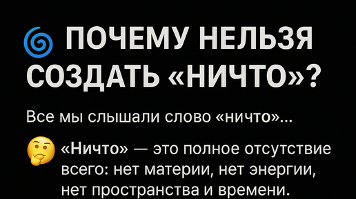 Каждый из нас хотя бы раз задумывался о том, что будет, если… не будет ничего. «Ничто» — слово короткое, но смысл у него огромный и совсем непростой. Попробуем разобраться вместе, почему абсолютно «ничто» создать невозможно. Что такое «ничто»? 🤔 Под «ничто» мы обычно понимаем полное отсутствие чего-либо: ни материи, ни энергии, ни пространства, ни времени. Абсолютный вакуум. Но уже здесь начинается первая загадка: само определение «ничто» предполагает, что кто-то его осознаёт. То есть, просто думая о «ничто», мы автоматически превращаем его в «что-то в уме»...