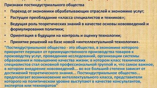 Постиндустриальное (информационное) общество — это этап общественного развития, характеризующийся преобладанием информации и знаний в качестве основного ресурса и движущей силы социально-экономического прогресса. Этот термин стал активно использоваться начиная с конца XX века, отражая глубокие преобразования, происходящие в мире под влиянием информационно-коммуникационных технологий. Значительный вклад в понимание процесса модернизации и трансформации обществ от традиционного к современному состоянию внесли: Д...