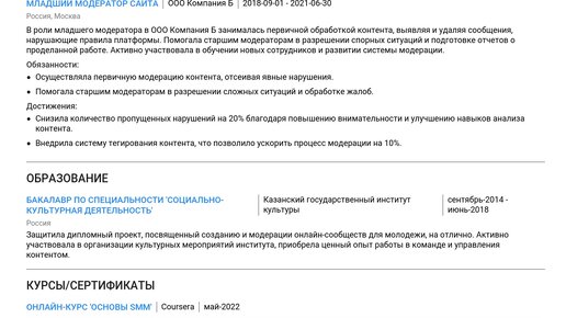 Изучите наш пример резюме модератора сайта, чтобы понять, как составить эффективное резюме, максимально повышающее ваши шансы получить работу. Готовые примеры станут вашей отправной точкой для создания документа, который заметят рекрутеры. На этой странице представлено подробное руководство по составлению резюме модератора сайта с пошаговыми инструкциями для каждого раздела, включая: Вы найдете советы, примеры и распространенные ошибки, независимо от того, являетесь ли вы начинающим или опытным специалистом...