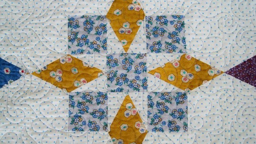 Вроде бы совершенно простой элемент блока, но какие сочетания с ним можно сделать! И этот элемент - ромб. Выполнить его можно разными способами, но результат всегда впечатляет. С ромбом можно сшить вот такой блок: Или вот такое покрывало: Схема сочетания элементов квадрат в квадрате и ромба: А посмотрите, как классно ромбы вписываются в квилт! С этими элементами можно сшить дорожку: Схема блока с использованием элементов квадрат...