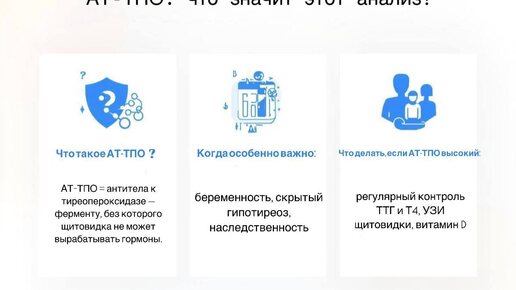 🎬Серия 3. АТ-ТПО: что значит этот анализ и зачем его сдавать? Все слышали про ТТГ, но гораздо реже — про антитела к щитовидке. Между тем, именно они часто «первыми» сигналят о проблеме. Что такое АТ-ТПО? АТ-ТПО = антитела к тиреопероксидазе — ферменту, без которого щитовидка не может вырабатывать гормоны. Если антитела высокие → иммунитет атакует собственную железу. Факт: У 10–15% здоровых людей находят повышенный АТ-ТПО. Но если они есть → риск развития гипотиреоза в будущем возрастает в 2–3 раза...