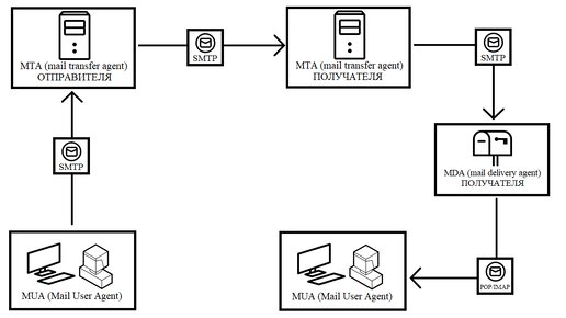 Перед прочтением ознакомиться: 1.1. Функционирование электронной почты. Введение. Давайте вспомним предыдущую статью, где вам стало известно, что обмен электронными сообщениями происходит следующим образом: Можно отдельно отметить протокол IMAP (Internet Message Access Protocol), который тоже служит для приёма писем клиенту. Но о протоколе IMAP мы поговорим позже, в следующих статьях. Поговорим о почтовых серверах. В момент отправления электронное письмо маршрутизируется с одного сервера на другой (почтовыми узлами), в результате доходит до почтового сервера получателя...
