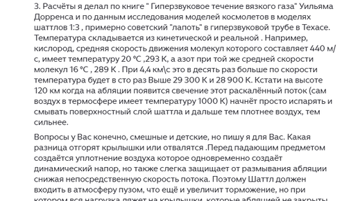 Я задал автору несколько [1] простых вопросов, чтобы понять, что именно он хотел сказать в предыдущем комментарии. В ответ получил не прояснение позиции, а новый сеанс технически звучащей самоуверенности: с гравитационным потенциалом, температурой в десятки тысяч кельвинов, горящей абляцией «Бурана» и даже коллегой из Хьюстона...