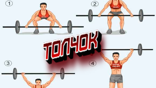 Что такое упражнение "толчок"? В идеальном толчке вы начинаете с позиции в передней стойке (это означает, что для начала нужно убрать вес вверх), локти высоко подняты, ноги на ширине плеч. Затем вы опускаетесь в приседание, а затем поднимаетесь вверх, используя импульс, чтобы поднять штангу над головой. Чтобы движение было засчитано, складка бедра должна проходить ниже коленей, и вы должны закончить движение с выжатой штангой над головой, при этом колени, бедра и локти должны быть прямыми, а голова...