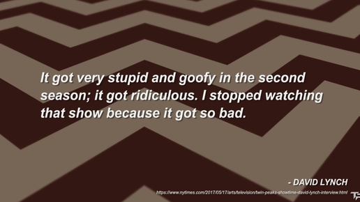 Существует легендарное видео на четыре с половиной часа, где чувак под ником Twin Perfect объясняет весь Твин Пикс. Рекомендую посмотреть видео, особенно если вам интересно кто такой Боб или что значит белая лошадь. В этой статье приведу некоторые интересные факты из этого видео. Первый факт из видео — Дэвид Линч не досмотрел второй сезон Твин Пикса. Так что если вы не досмотрели Твин Пикс, не расстраивайтесь! Дэвид Линч тоже его не досмотрел. Дэвид Линч в Твин Пиксе играет директора ФБР. Дэвид Линч — режиссер Твин Пикса...