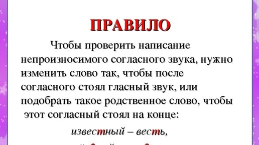 Непроизносимые согласные — это звуки, которые не произносятся в устной речи, но пишутся на письме. В русском языке чаще всего встречаются следующие непроизносимые согласные: "в", "л", "д", "т". Они могут встречаться в словах, где несколько согласных идут подряд, например, "солнце", "сердце". Для проверки написания слов с непроизносимыми согласными, можно использовать однокоренные слова, в которых эти согласные будут произноситься отчётливо. Например, в слове "солнце" непроизносимая согласная "л" проверяется словом "солнышко"...