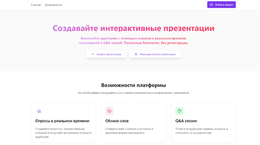 Что это за сервис: интерактивная платформа для живых опросов, голосований, облаков слов, веб-сессий; можно подключать аудиторию в режиме реального времени.