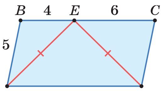 Задача: Точка E делит сторону BC параллелограмма ABCD на отрезки с длинами 4 и 6, при этом AE = ED. Найдите отрезок AE, если AB = 5. ©Математическая Вертикаль. Учебное пособие для общеобразовательных организаций. Автор: М.А.Волчкевич. Решение: CD = AB = 5 по св-у параллелограмма. △AED - равнобедренный по определению ⇒ ∠EAD = ∠EDA по св-у р/б треугольника, обозначим их углами α. ∠BEA = ∠EAD = α как накрест лежащие при пересечении параллельных AD и BC секущей AE. В △AEB по теореме косинусов: x^2...