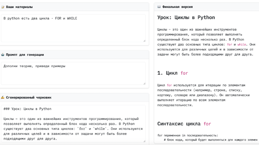 Режим Creator - полноценный конструктор тестовых уроков с AI ассистентом. Чтобы создать курс в ручном режиме, выберите Creator-курс. Данный режим позволяет создавать курсы и уроки к ним на основе ваших подготовленных материалов. Допустим вы давно планируете собрать воедино какие-то наработки, заметки, черновики. Здесь открывается возможность для того, чтобы систематизировать все это, разложить на отдельные уроки, а самое главное - написать запрос для AI, что нейросеть сделала необходимые правки, проверила тексты на ошибки, дополнила теорию или придумала дополнительные примеры...