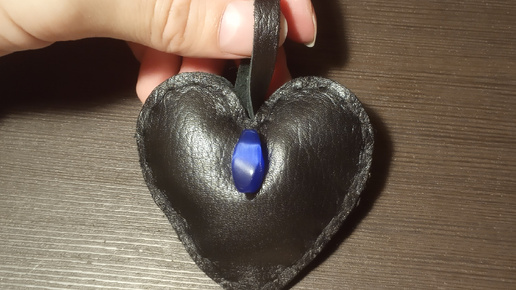 Сердечко-брелок из натуральной кожи чёрного цвета с синим камнем "кошачий глаз" своими руками