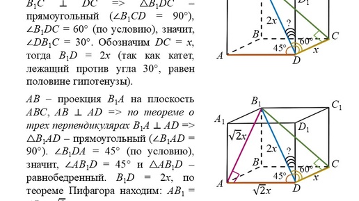 На днях готовились с ученицей к ВПР, надо было разобрать следующую задачу: Дан прямоугольный параллелепипед АВСDА1В1С1D1. Его диагональ В1D составляет с ребром АD угол 45°, а с ребром DС угол 60°. Найдите угол между прямыми В1D и DD1...
