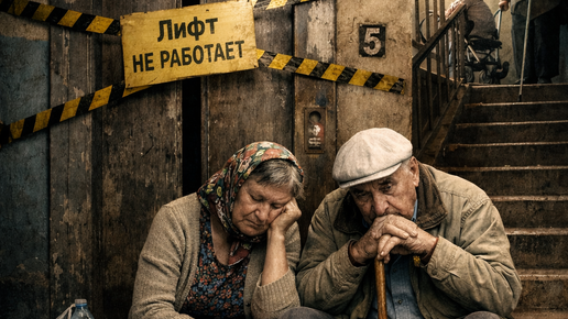 "Лифт работал сорок лет без проблем, а теперь чинить некому и не на что" Три недели назад Бабушка с Дедом спускались с восьмого этажа. Зашли в лифт, нажали кнопку. Лифт дёрнулся, поехал вниз. На пятом этаже застрял! Стоит и не едет! Ни вверх, ни вниз! Дед кнопку "вызов" нажал. Долго никто не отвечал. Потом голос: — Слушаю. — У нас лифт застрял! Пятый этаж! — Сейчас вызовем мастера. Ждите. Ждали полчаса! Полчаса в тесной кабинке! Бабушка чуть не задохнулась, духота страшная! Хорошо хоть Дед с собой воды бутылочку носит, попила немного...