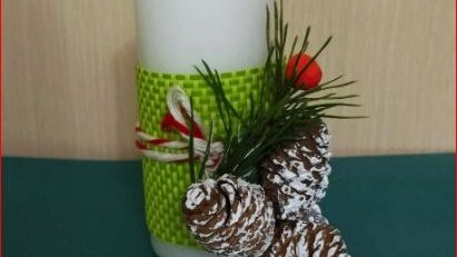 Всегда с интересом смотрю, как умелые руки превращают скучную и заурядную вещь в интересный декор. Например, обычную свечу в атрибут новогоднего праздника. Использовать можно что угодно - салфетки, мешковину, кружево, упаковочную бумагу, тесьму, всевозможные бусины, мелкие елочные игрушки, шишки, кору деревьев и даже обычные веточки. Вот один из вариантов "сделай сам" в моем исполнении: Понадобился кусочек сервировочной салфетки или ланчмата, веревочка, веточка сосны, три шишки и яркий шарик из легкого пластилина...