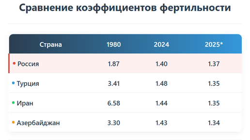 За первые 7 месяцев 2025 года рождаемость в Турции упала на 8.29%. И это при том, что число женщин фертильного возраста всё ещё растет. С учётом этого суммарный коэффициент рождаемости (СКР) провалился до 1.34-1.35. Это уже ниже, чем в России, где СКР сейчас на уровне 1.37. В 2025 году мы наблюдаем тектонические сдвиги. Новости пришли сразу из трёх крупных стран, где рождаемость упала ниже российской: Турция, Иран и Мексика. Все они традиционно считались оплотами высокой фертильности. Рождаемостью Мексики пугали США, а рождаемостью Ирана и Турции — Европу и Россию...