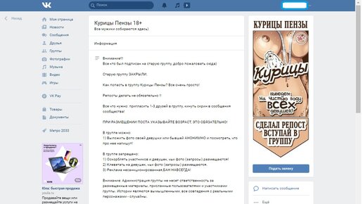Статья о том как разводят невинных девушек.Пишут абсолютно всем у кого открыты личные сообщения. Схема проста. Мошенники покупают группы ВКонтакте и страницы девушек.Далее они делают группу закрытой,переименовывают её в что то типа Курицы твоего города 18+ или как нибудь ещё. Подделывают скриншот на котором видна предложенная новость,подписчики группы и замазанный автор поста.В этом посте ваша фотография и написано что то вроде: "Шкура из (твой город) Зовут (имя) Останется у тебя на ночь после первого свидания...