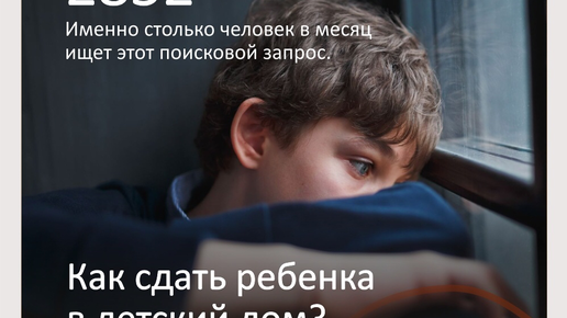 2 852 человек в месяц ищет запрос в поисковых системах "Как сдать ребенка в детдом". Если глубоко размышлять, то приемные родители, представим в идеале, у которых уже установлен контакт с органами опеки, понимают, куда обращаться в случае сложностей с детьми. Что это значит? Это значит, что люди, которых интересует этот запрос - кровные родители, которым в этот момент стало невыносимо сложно справляться со своими обязанностями. Рано или поздно эти люди могут...