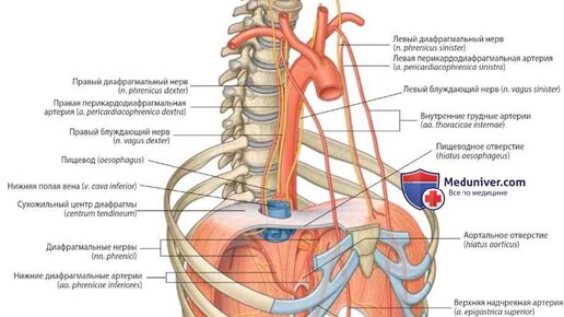 Диафрагма - тонкая мышечная и сухожильная перегородка разделяющая грудную полость и брюшную. Представляет из себя что-то похожее на купол или парашют. По верхней части к ней прилегают наши лёгкие и перикард, ниже: печень, желудок и другие органы. Прикрепляется к позвоночнику в поясничном отделе, рёберной дуге, мечевидному отростку и мышцам кора. Всё это перечисляю не просто так, это очень важно. Все анатомические структуры, идущие из грудной полости в брюшную и обратно, проходят через диафрагму, либо проходят за ней...