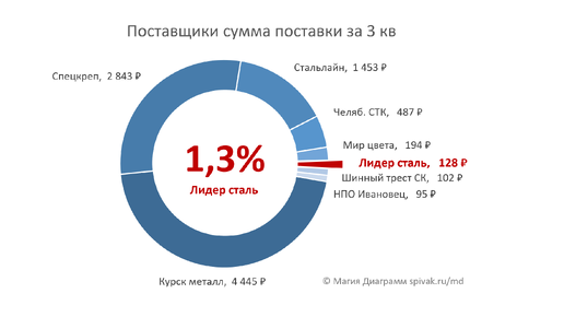 Как показать игрока с низким значением на круговой диаграмме? Инструкция для Excel. Обычно данные сортируют по убыванию, и мелкие игроки собираются в верхней части круговой диаграммы налезая друг на друга. Иногда пытаются вручную выделить маленького игрока, делая выноски, но выглядит это не красиво. Стандартный вариант круговой диаграммы Мне нужно сделать акцент не маленьком поставщике Лидер сталь, которого сейчас даже не видно в общей каше. Как я исправлю ситуацию за 4 шага? Шаг №1️⃣. Разворот...