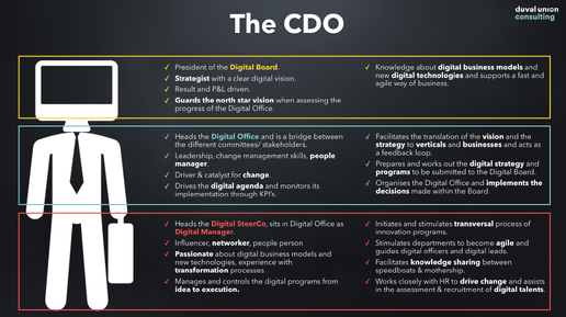 CDO (Chief Digital Officer) — руководитель цифровой трансформации, директор по цифровым технологиям. Каждая компания, которая сегодня хочет минимума конкуренции, должна обязательно извлечь хоть что-то из этой цифровой волны, иначе, вас опередят. Небольшое улучшение эффективности процесса или новые рыночные возможности могут добавить миллионы к чистой прибыли. В то время как тяжелое промышленное производство может быть относительно консервативным и медленным, чтобы реагировать на новые технологии, безусловно, есть преимущества для тех, кто действительно движется вперед...