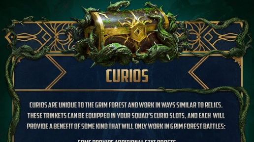 Диковинки Диковинки уникальны для Мрачного леса и работают аналогично реликвиям. Их можно экипировать в слоты для диковинок вашего отряда, и каждый из них предоставит определенное преимущество, которое будет работать только в битвах Мрачного леса: - Некоторые дают дополнительные повышения характеристик. - Другие диковинки усиливают ваших чемпионов...
