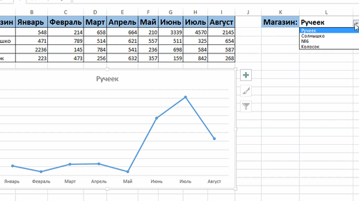 Добрый день, уважаемые читатели! Сегодня мы рассмотрим вопрос, который поступил от одного из читателей блога — как построить динамическую диаграмму (график)? То есть, чтобы график сам перестраивался в зависимости от выбранных условий и без удаления данных. Как говорится — хороший вопрос! Приступим. Для начала построим таблицу с любыми данными, динамику которых нужно отслеживать. Далее создадим выпадающий список выбора (магазинов). Для этого перейдём на вкладку «Данные», в блоке кнопок «Работа с...