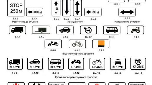 Практически все знаки этой группы никогда не устанавливаются отдельно. Они дополняют, уточняют или ограничивают действие знаков, с которыми они применены. 8.1. «Расстояние до объекта». Знаки 8.1.1, 8.1.3, 8.1.4 указывают через сколько метров будет начинать действовать знак с которым они установлены. Данный знак также называется "расстояние до объекта". Он применяется совместно со знаком 2.4 "уступите дорогу" и указывает расстояние до перекрестка, перед которым будет установлен знак 2.5 "движение без остановки запрещено"...