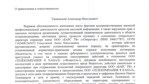 «8 КАНАЛ» ТРЕБУЕТ ПРИВЛЕЧЬ РУКОВОДИТЕЛЯ СТРУКТУРЫ, ВХОДЯЩЕЙ В ГРУППУ КОМПАНИЙ «ОРИОН» К УГОЛОВНОЙ ОТВЕТСТВЕННОСТИ Генеральный директор «8 Канала» Иван Головкин обратился к начальнику ГУ МВД по Красноярскому краю Александру Соловьеву с требованием проверить гендиректора «Барс-ТВ» Анну Симулину на предмет самоуправства (ст. 330 УК РФ). Полтора года назад «8 Канал» незаконно отключили от вещания в сетях «Орион Телекома»...
