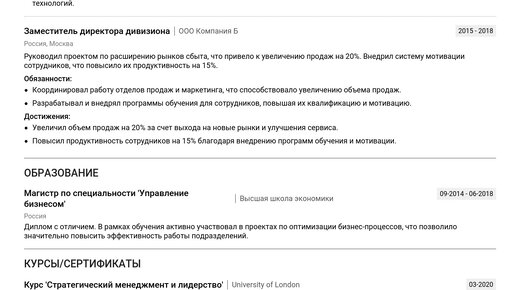 Наш **пример резюме директора дивизиона** покажет, как использовать готовые образцы для создания действительно эффективного документа. Изучив его, вы значительно повысите свои шансы на получение желаемой должности. На этой странице вы найдете не просто **готовые примеры**, но и **пошаговые инструкции** для каждого раздела, учитывающие **требования работодателей** и актуальные **навыки**. Материал будет полезен как для **начинающих**, так и для **опытных** специалистов, помогая грамотно **адаптировать резюме под вакансии**...