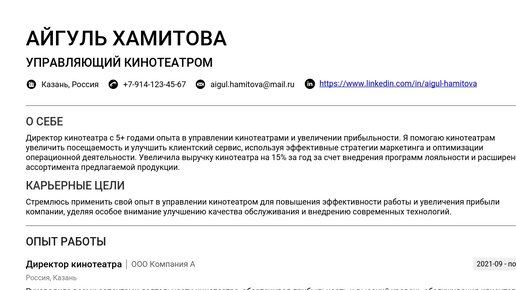 Изучение готового примера резюме директора кинотеатра — ваш первый шаг к созданию эффективной самопрезентации. ✨ Он наглядно покажет, как представить опыт и навыки, чтобы получить желаемую позицию. Здесь вы найдете готовые примеры резюме директора кинотеатра и пошаговые инструкции по его составлению. Мы подробно разбираем все ключевые разделы документа, от контактов до навыков: Независимо от вашего опыта, здесь есть полезная информация для вас. Изучив пример, вы сможете создать резюме с помощью нашего конструктора резюме...