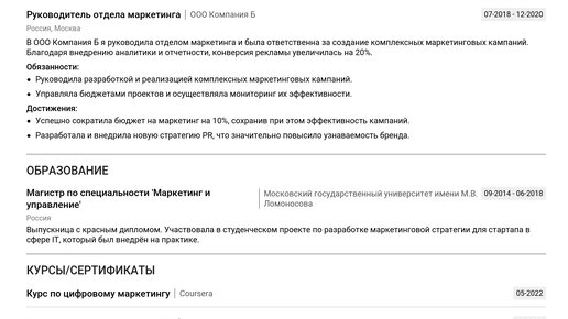 Пример резюме Директора по маркетингу и PR (CMO) — ваш ключ к созданию сильного документа 💡. Изучение готовых примеров поможет составить эффективное резюме, которое приведет к заветному предложению о работе. Здесь представлен пример резюме Директора по маркетингу и PR, готовый к адаптации под ваш уровень и опыт. Мы пошагово рассмотрим каждый раздел: от заголовка и контактов до описания опыта, образования и навыков, уделяя внимание актуальным требованиям работодателей. Вы узнаете, как правильно адаптировать резюме и какие навыки сейчас ценятся...