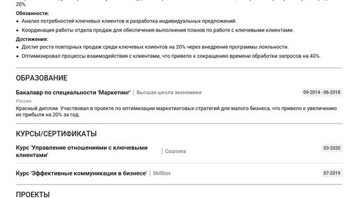 Пример резюме директора по работе с ключевыми клиентами поможет вам изучить готовые примеры. Используйте их, чтобы составить по-настоящему эффективное резюме и получить работу мечты. На этой странице собрано все необходимое для создания сильного резюме директора по работе с ключевыми клиентами, независимо от вашего опыта. Вы найдете: Изучив пример, вы сможете быстро и просто создать свое резюме с помощью нашего конструктора резюме. Заголовок резюме должен четко отражать вашу специализацию и уровень позиции...
