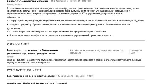 Ищете пример резюме директора продуктового магазина? Изучение готовых примеров — самый эффективный способ понять, как составить сильное резюме и получить приглашение на собеседование. В этом материале мы разобрали пример резюме директора продуктового магазина с детальными комментариями. Вы получите для каждого раздела, узнаете, какие навыки наиболее востребованы и как адаптировать резюме под актуальные требования работодателей. Наш подробный разбор будет одинаково полезен как начинающим специалистам, так и опытным руководителям...