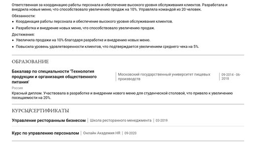Пример резюме директора столовой покажет, как составить документ, который привлечет внимание работодателя. Изучение готовых примеров — лучший способ быстро создать по-настоящему эффективное резюме. В этой статье вы найдете готовые примеры резюме директора столовой для специалистов разного уровня и получите пошаговые инструкции по заполнению каждого раздела. Мы покажем, как правильно описать: а также дадим советы по адаптации резюме под конкретные вакансии. Изучив пример, вы сможете создать резюме с помощью нашего конструктора резюме...