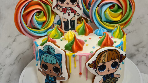 Девочка любит куклы L.O.L., поэтому торт конечно с ними. Яркие безе, куклы напечатаны на сахарной бумаге, закреплены на пряниках с помощью нейтрального геля. Подтеки я делаю на сливках. Шоколад + сливки...