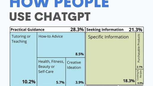 Популярность сервисов на базе искусственного интеллекта продолжает расти. Инфографика показывает, для решения каких задач люди используют ChatGPT. Согласно отчету OpenAI, пользователи используют ChatGPT как по рабочим, так и по личным вопросам. С рабочими задачами связано примерно 30% запросов, остальные 70% — с другими задачами в повседневной жизни. В повседневной жизни сервис используется для выполнения практических задач. Примерно три четверти пользователей просят дать практический совет, найти информацию и написать текст...