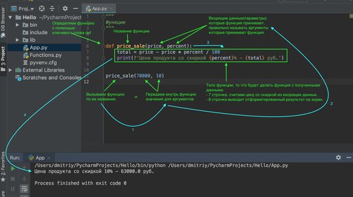 Функции очень часто используются в программировании. В предыдущих статьях мы уже встречались с встроенными функциями такими как ( print(), input(), len() и т.д. ). Попробуем разобраться что такое функции и как написать свою функцию. Что такое функция? Функция создается при помощи ключевого слова def, далее пишется название (имя) функции. Название функции пишем по тем же правилам что и название переменных (в названии используются маленькие латинские буквы, подчеркивания, цифры). После названия идут круглые скобки и двоеточие...
